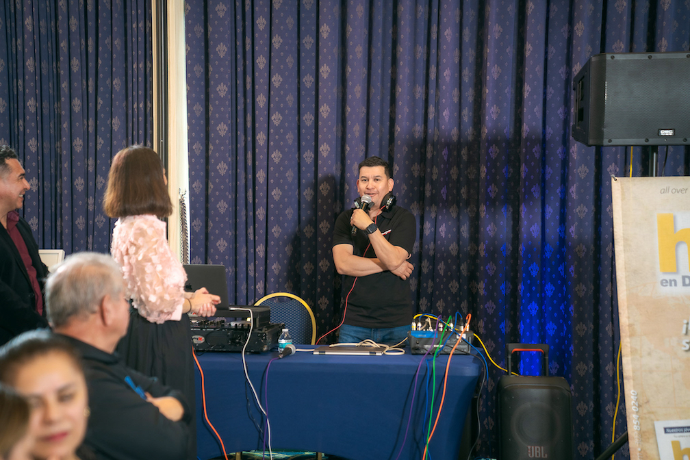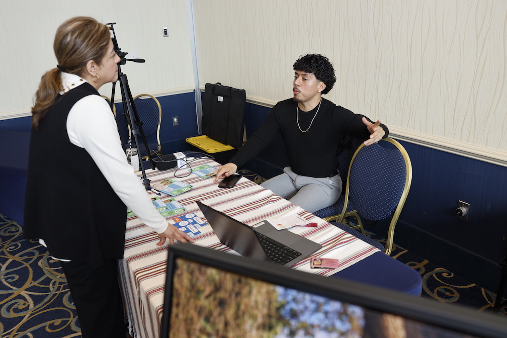 Rocky Roblero (Conociendo Delaware) en un momento de la entrevista a Virginia Esteban–Somalo (editora de HOY en Delaware) y MC de MXVM Expo (Foto HOY en Delaware). Johnny Pérez-González (WHYY) trabajando desde su espacio en MXVM (Foto HOY en Delaware)