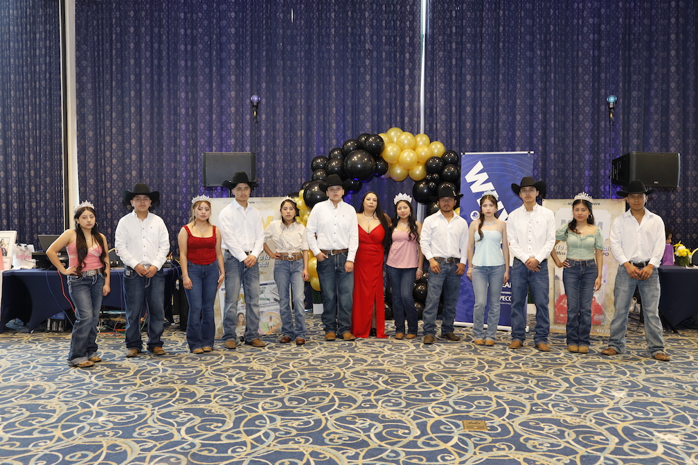 Dña. Irene Córdoba homenajeada como Reina de MXVM Expo, rodeada de su corte de quinceañeras de honor (Foto Malváez Photography)