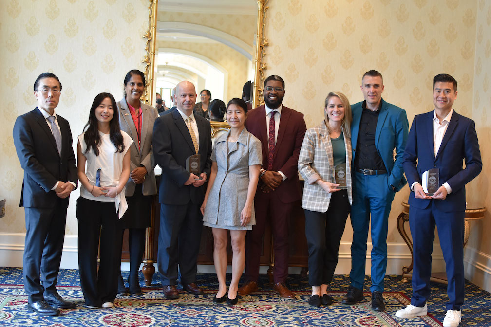 (L to R) Dr. Leo Kim and colleague (Higher Medicine, Inc), Secretary of State Charuni Patibanda-Sanchez, Dennis Wysocki and Karen Lai (Essence Infusing), DSB Director CJ Bell, Rachel & Dustin Parker (Archie), and Steen Ooi (Livestock Labs), not pictured Rishi Khan (AKOS Solutions, LLC). Photo Courtesy: SBDC.