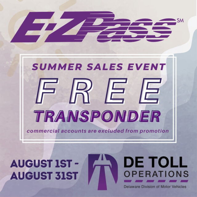 The Delaware Division of Motor Vehicles (DMV) and E-ZPass Delaware invite customers to take advantage of a free transponder event starting Friday, August 1, 2025 and continuing through Sunday, August 31, 2025.
