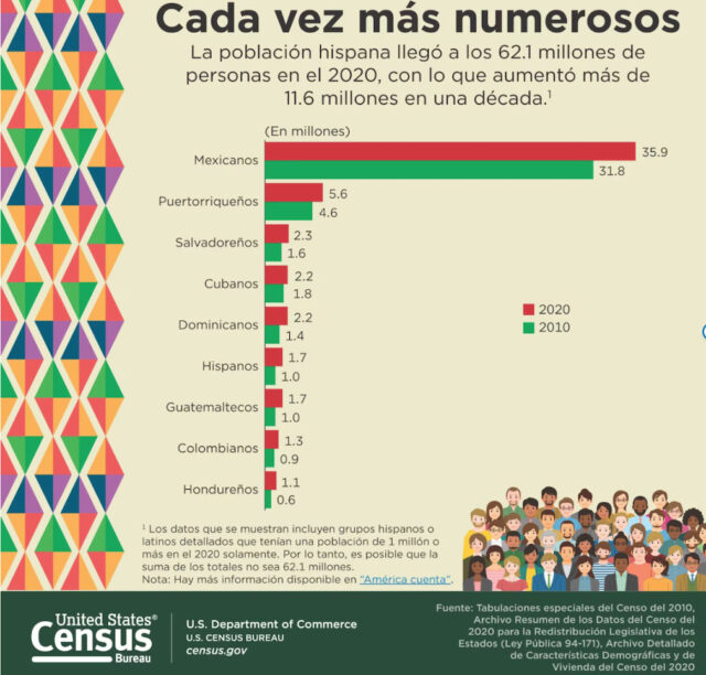La poblaciรณn hispana de los Estados Unidos al 1 de julio de 2023, lo cual convierte a las personas de origen hispano en la minorรญa รฉtnica o racial mรกs numerosa del paรญs: el 19.5 % de la poblaciรณn total.