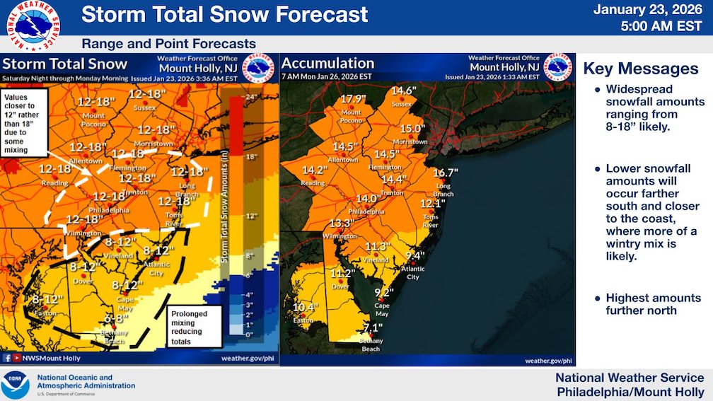 El Servicio Meteorológico Nacional informó que los meteorólogos tienen cada vez más confianza en que comenzará a nevar intensamente el sábado por la noche, y en el caso de New Jersey se prevé que la mayor parte del estado podría recibir en algunos casos hasta 45 centímetros de nieve para el lunes.