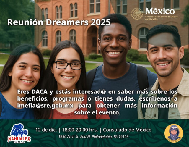 El Consulado de México en Filadelfia celebrará una Reunión de Beneficiarios DACA el viernes 12 de diciembre, de 6:00 p.m. a 8:00 p.m., en sus instalaciones ubicadas en: