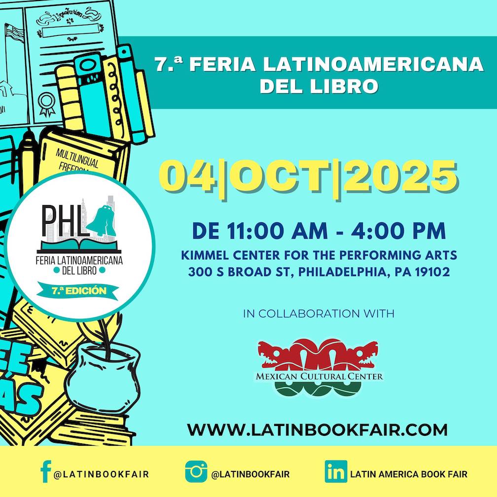 Si quiere disfrutar de una tarde mágica de literatura, música y tradiciones, no dude en acudir este sábado 4 de octubre de 11am a 4pm a la 7ª Feria del Libro Latinoamericano en la Plaza del Kimmel Cultural Campus de Filadelfia.