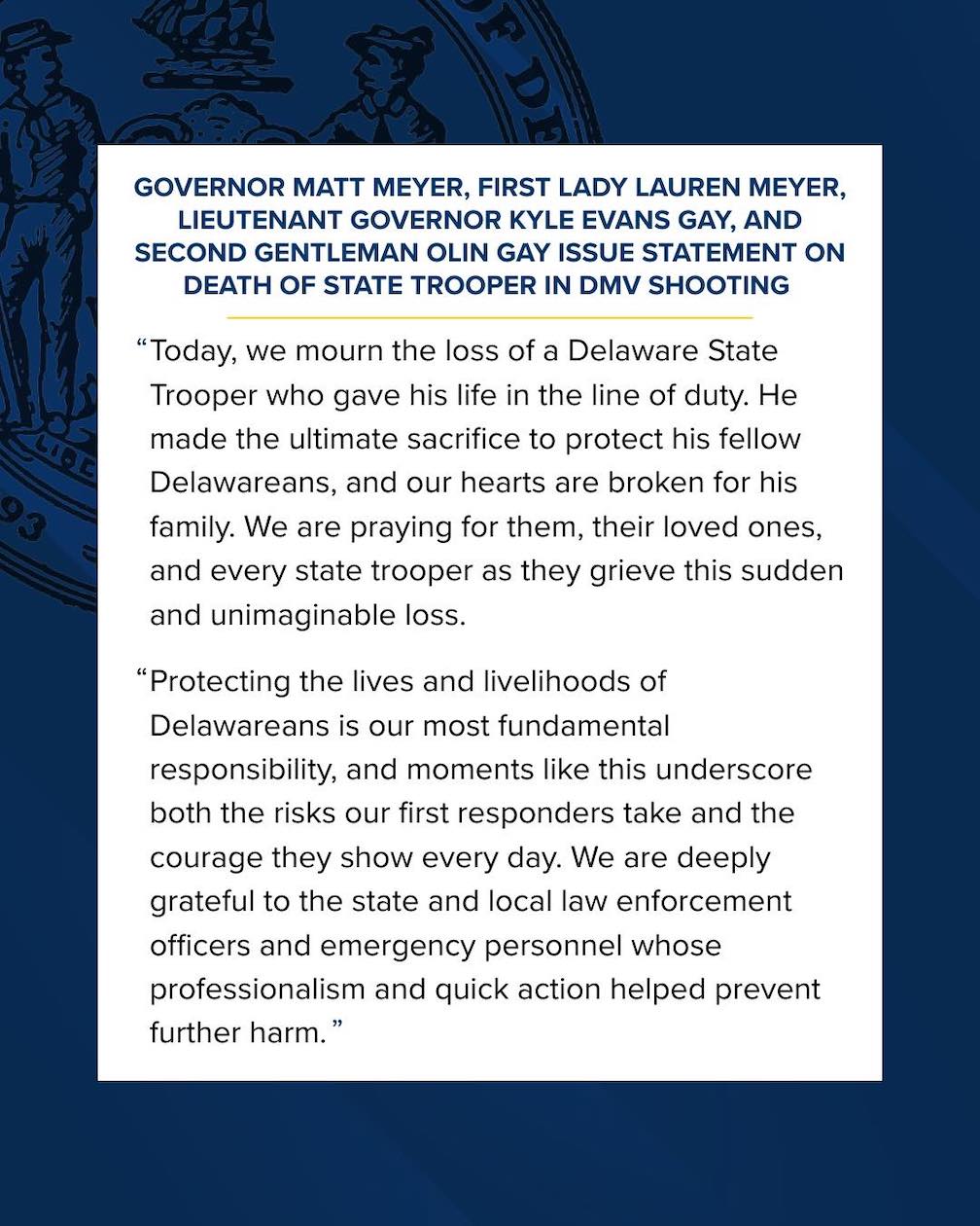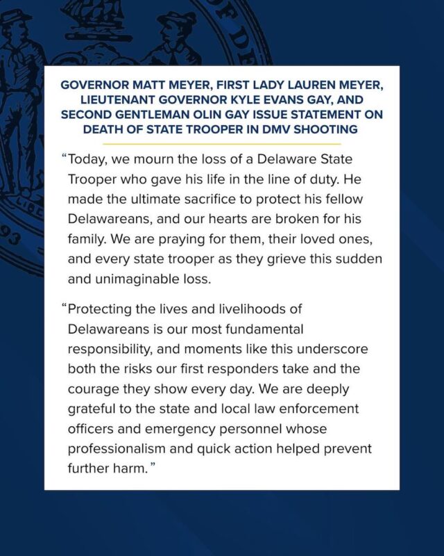 Governor Meyer, First Lady Lauren Meyer, Lieutenant Governor Kyle Evans Gay, and Second Gentleman Olin Gay issued the following statement: “Today, we mourn the loss of a Delaware State Trooper who gave his life in the line of duty. He made the ultimate sacrifice to protect his fellow Delawareans, and our hearts are broken for his family. We are praying for them, their loved ones, and every state trooper as they grieve this sudden and unimaginable loss.