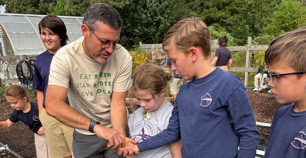 Sussex Academy Elementary math and science teacher and garden coordinator Don Ott was a featured speaker at Healthy Foods for Healthy Kids’ Meet Our Heroes event Nov. 5. Ott, second from left, pours seeds into the hands of young gardens (l-r) Rowan Kirk, Stihl Thompson, Daisy Huerta, Colton Lane and Cameron Evans as they prepare the school’s fall garden (Photo courtesy Sussex Academy)