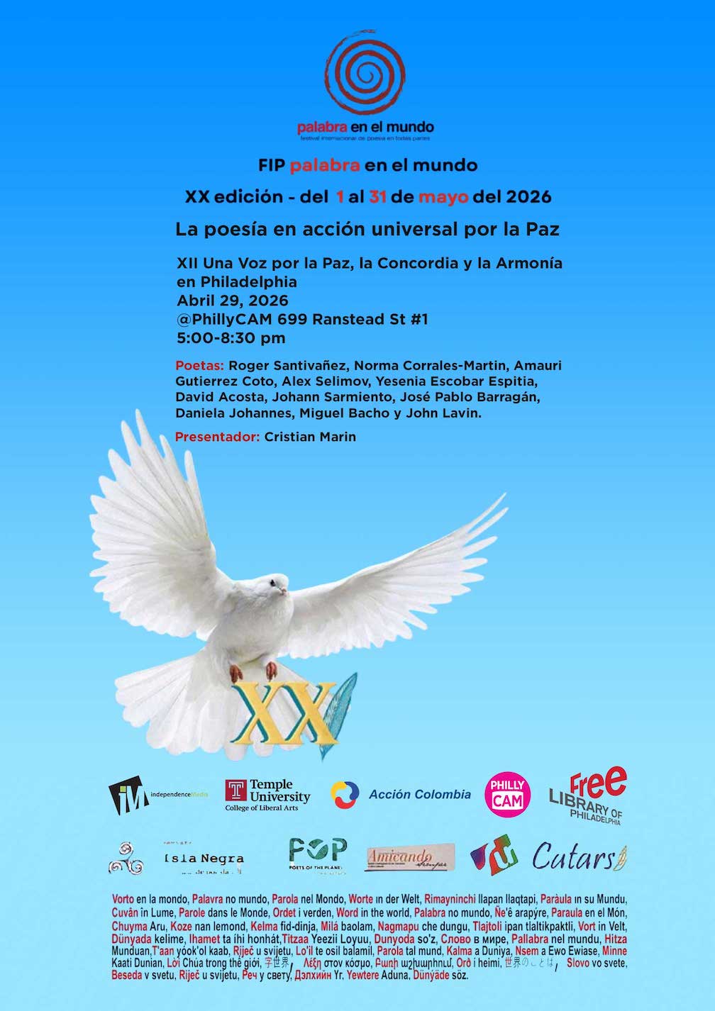 Filadelfia, PA – Abril 14, 2026 – El XII Festival Internacional de Poesía en Filadelfia, parte del XX Festival International de Poesía Palabra en el Mundo, reunirá el próximo miércoles 29 de abril a destacados poetas de América Latina y Estados Unidos en una velada única de literatura, conexión y música. Este encuentro anual, titulado «Una voz por la paz, la concordia y la armonía», celebra el poder transformador de la poesía como puente para la paz, el florecimiento de voces auténticas y la conexión entre comunidades.